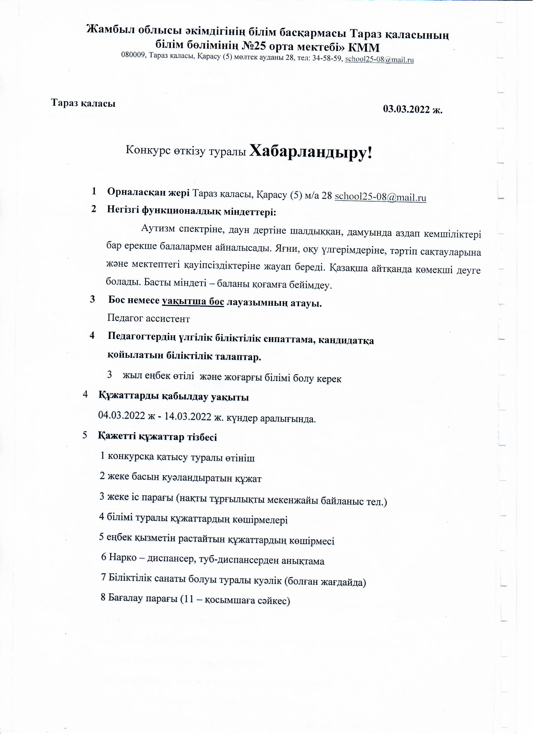 Бос орынға педагогтарды қабылдау конкурсы » СШ №25