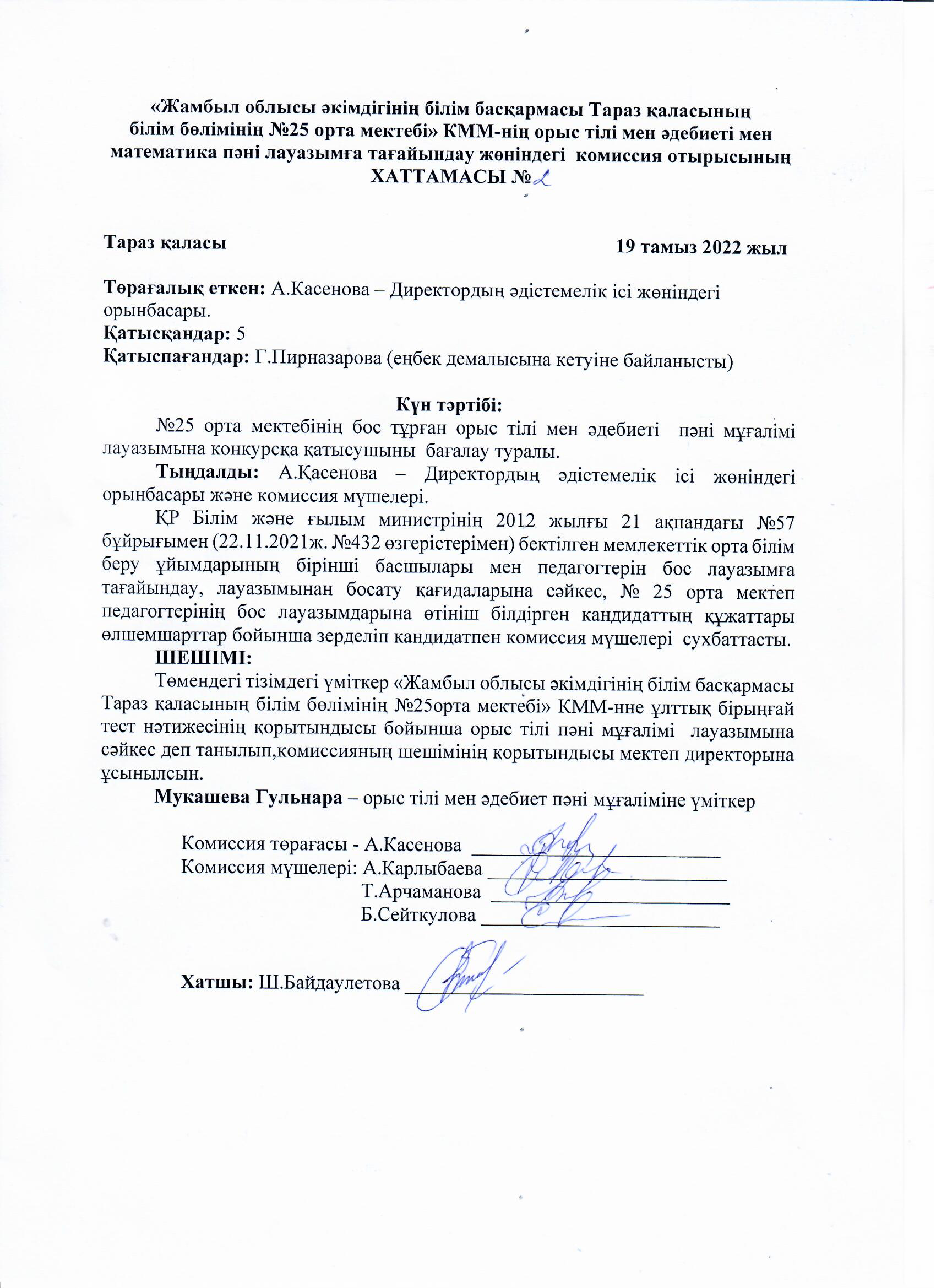 Педагог лауазымына қабылдау конкурсының хаттамасы » СШ №25