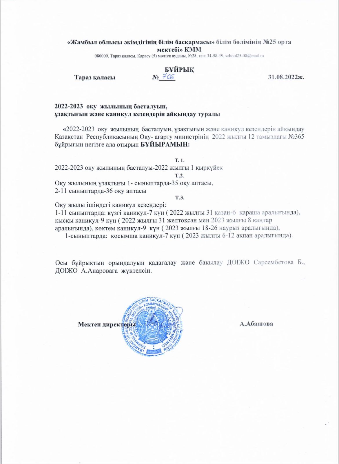 01 сентябрь 2022 0 1 2 3 4 5 2022-2023 оқу жылының басталуын,ұзақтығын және каникул кезеңдерін айқындау туралы
