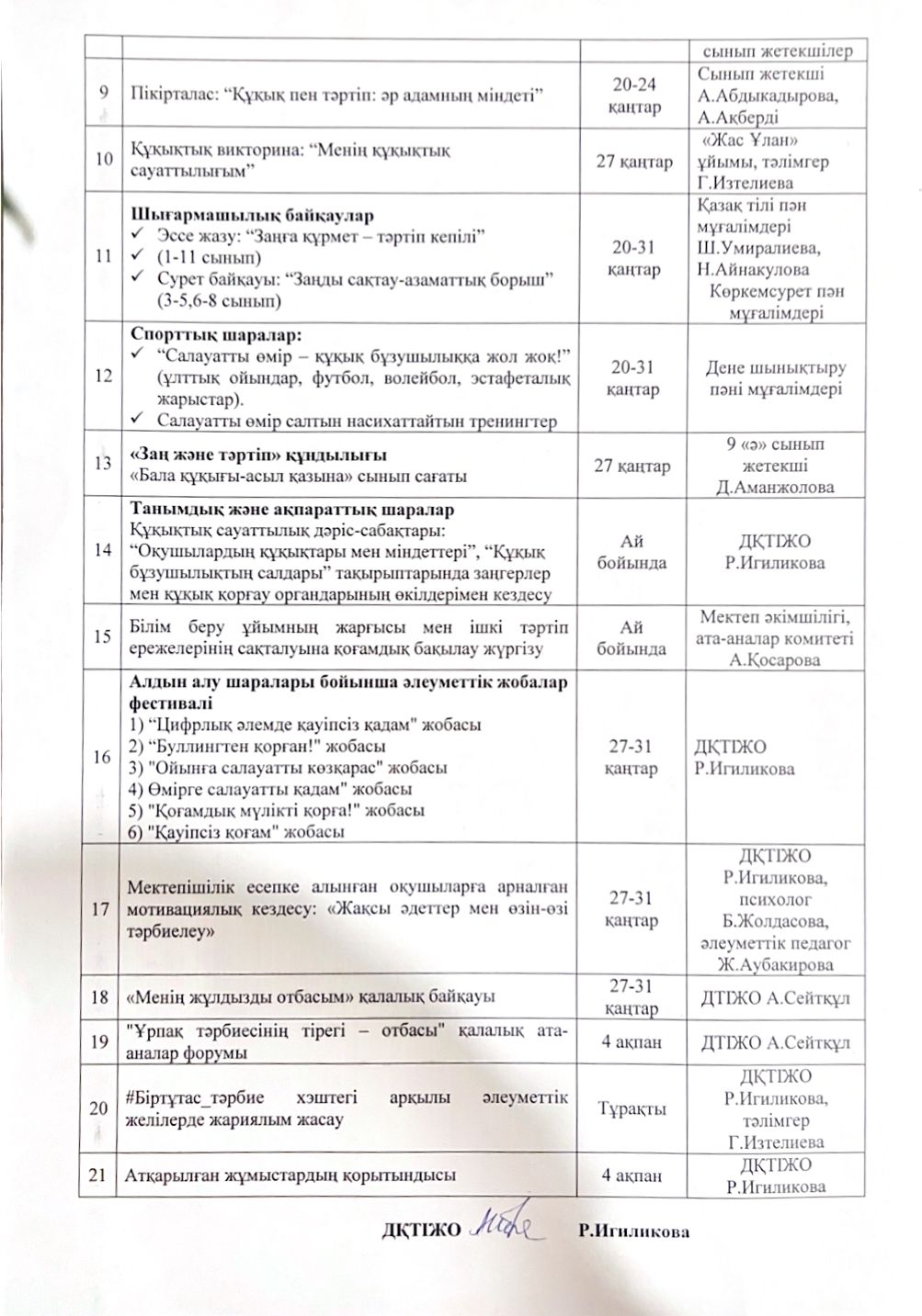 "Заң және тәртіп" айлығының жұмыс жоспары