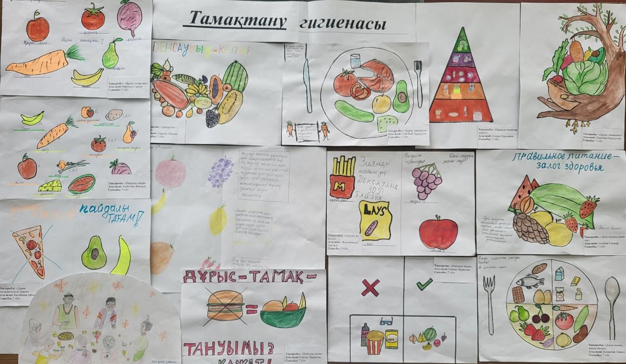 2022-2023 оқу жылының 30 наурыз күні әлеуметтік педагог А.Ермаханованың ұйымдастыруымен "Тамақтану гигиенасы" сурет көрмесі 7-8 сынып оқушылары арасында өткізілді. Сурет көрмесі мақсаты: дұрыс тамақтану туралы түсініктерін кеңейту, денсаулықты күтуге, дұрыс тамақтана білуге тәрбиелеу.