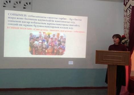 12 қазан күні «Өз балаңа үлгі бол» тақырыбында 8-9 сынып ата-аналарына, 13 қазан күні 2,3,4 сынып оқушыларыата-аналарына жиналыс өтілді. Жиналысқа 164 ата-ана қатысты. Ата-аналар конференциясында мектеп психологі Б.Жолдасова балаларды интернет арқылы түсетін жағымсыз ақпараттан қалай қорғау керек, интернетке тәуелділік қалыптасуының алдын алу, мектепке діни атрибутика киюге тыйым салу, отбасылық құндылықтарды ілгерілету және нығайту, баланың өзін-өзі бағалауын арттыру, ойын, жағымды мотивация жасаудың үздік тәсілдері жөнінде айтылды. Баланың ақпараттық қауіпсіздігін қамтамасыз етудің «Жеті шектеу» ережесі, ҚР бала құқығы жөніндегі уәкілдің-балалар мен жастарға арналған ұлттық Сенім телефоны мен ҚР БҒМ Балалардың құқықтарын қорғау комитетінің сенім телефондары таныстырылды. «Үндеу», «Менің Қазақстаным», «Балалар және интернет-қауіпсіздік жолдары», «Балалар және дін», «Тату отбасы-бақытты бала-гүлденген ел», «Әке, мені вальске шақыр!», «Анасы мен қызы», «Балаларымыздың болашағы-біздің қолымызда» тақырыбындағы бейнекөріністер көрсетілді. Мектеп директоры А.Абашова Қазақстан Республикасы Білім және ғылым министрлігі Балалардың құқықтарын қорғау комитетінің төрағасы Оршыбек Нұрбек Әбубекұлының үндеу хатымен таныстырды, сауалнама толтырып, жаднама таратылды.