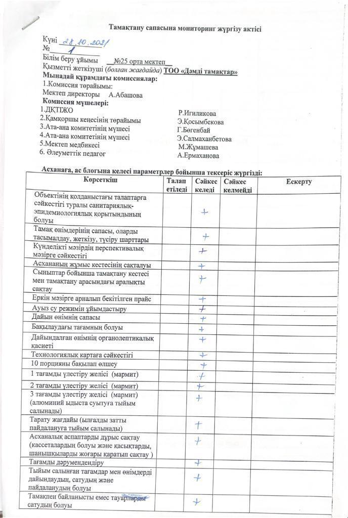 Тамақтану сапасына мониторинг жүргізу актісі » СШ №25