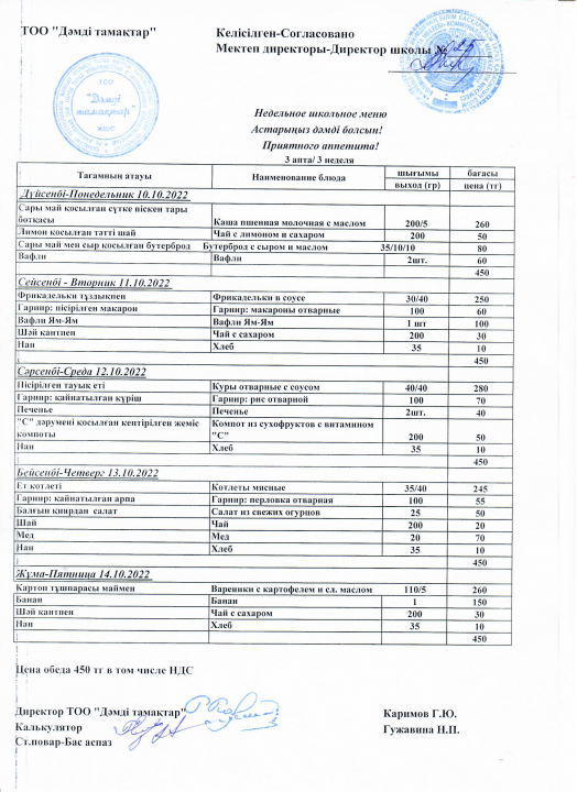 10 октябрь 2022 0 1 2 3 4 5 Апталық ас мәзірі. 10.10. - 14.10.2022 аралығындағы мектептің апталық ас мәзірі