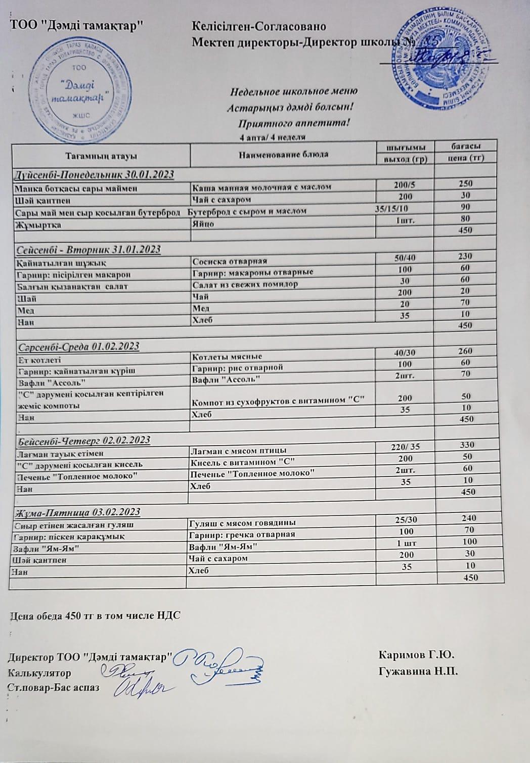 Мектептің 30.01.2023 - 3.02.2023 ж. апталық ас мәзірі.