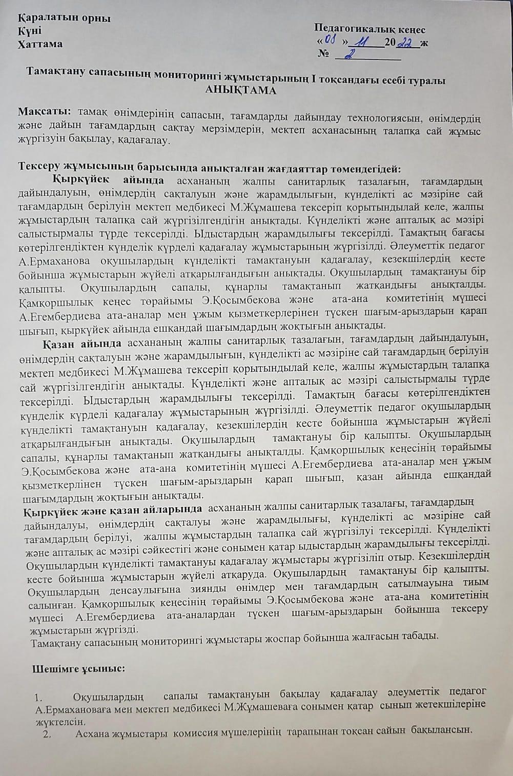 » » Тамақтану сапасының мониторингі жұмыстарының есебі