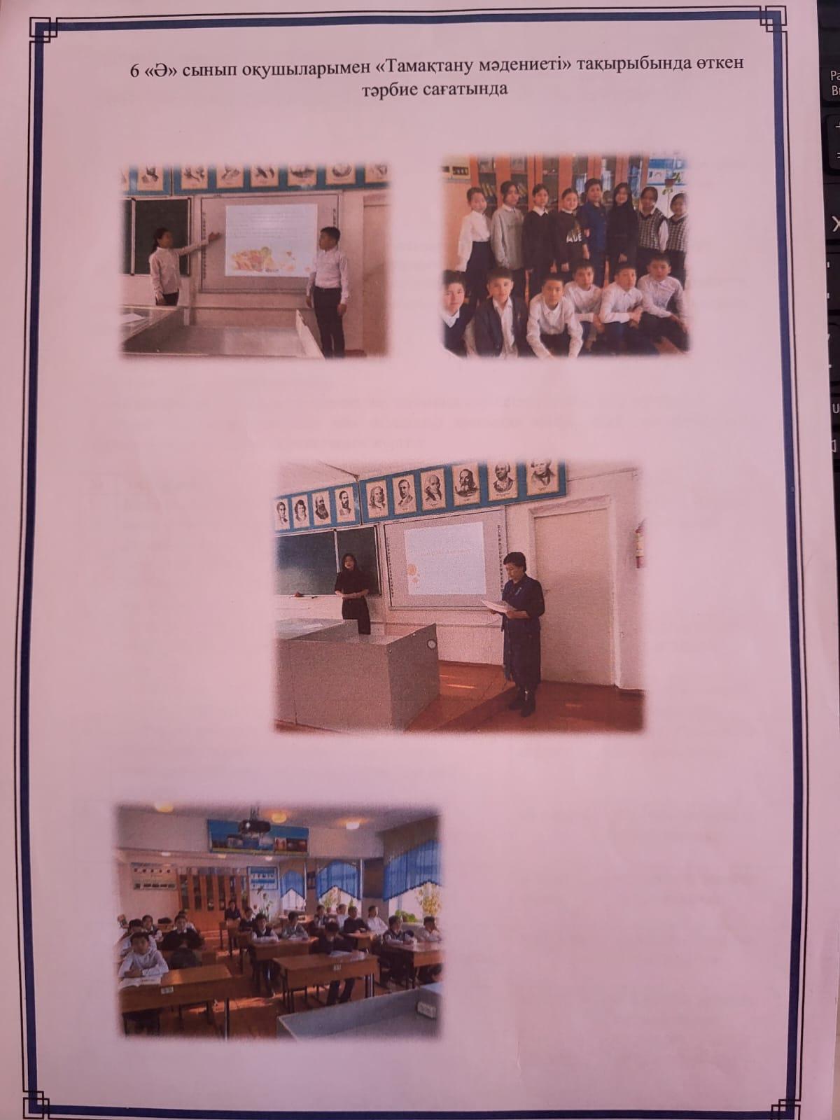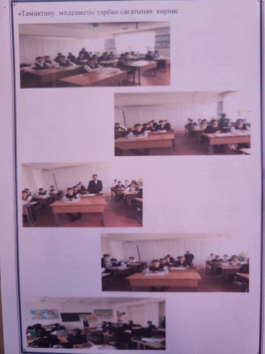 2022 -2023 оқу жылының қаңтар айында 6 сынып оқушыларымен "Тамақтану мәдениеті" тақырыбында тәрбие сағаттары өткізілді. Дұрыс тамақтану, уақытылы тамақтану туралы түсінік қалыптастыру, оқушылардың ой өрісін дамыту, салауатты өмір салтын ұстануды дәріптеу мақсатында өткізілген тәрбие сағаттарында "Көкөніс базары", "Тамақтану бағдаршамы", "Ия, жоқ" ойындары жүргізіліп, "Ашық микрофон" әдісі бойынша сұрақтарға оқушылар жауап берді. Сонымен қатар оқушылар түрлі жағдаяттарды шешіп, түрлі ырым-тыйым, мақал-мәтелдерін оқушылар ортаға салды.