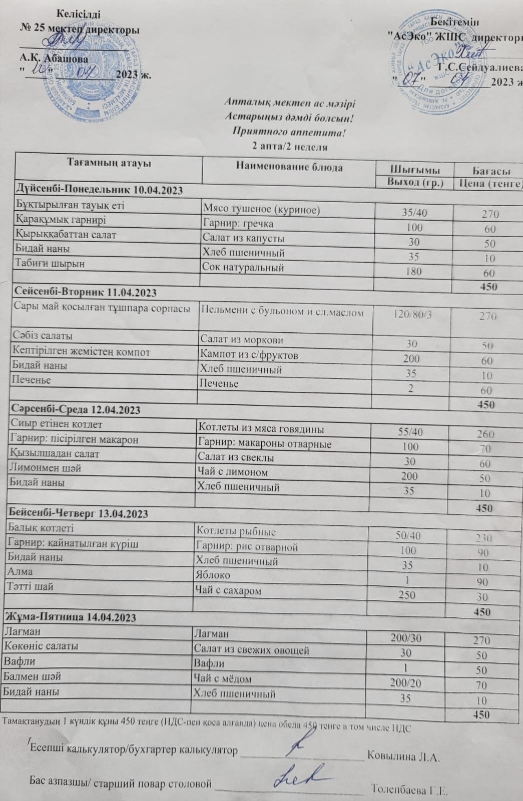 » » Апталық ас мәзірі