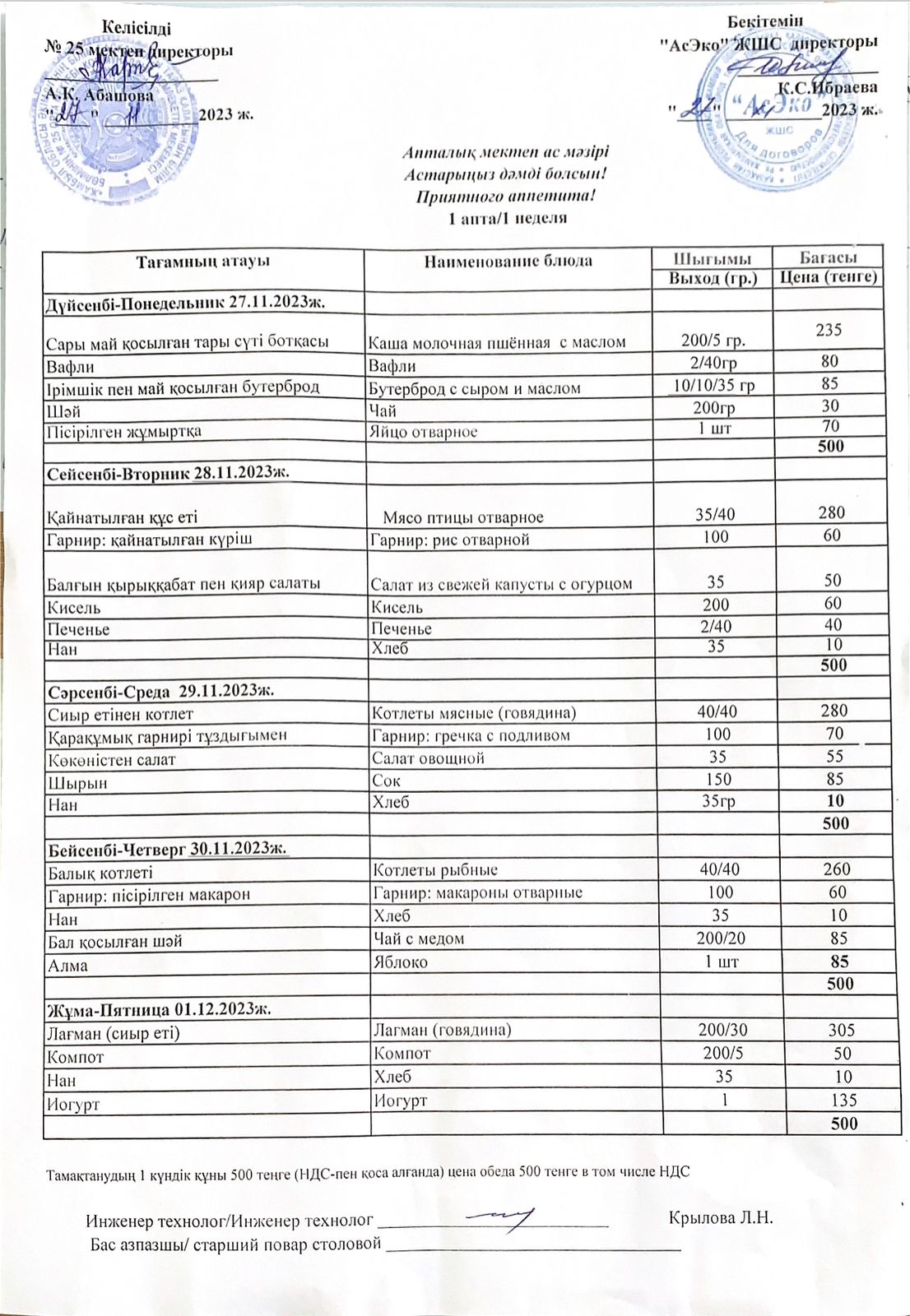 27/11/2023-01/12/2023 аралығында ас мәзірі