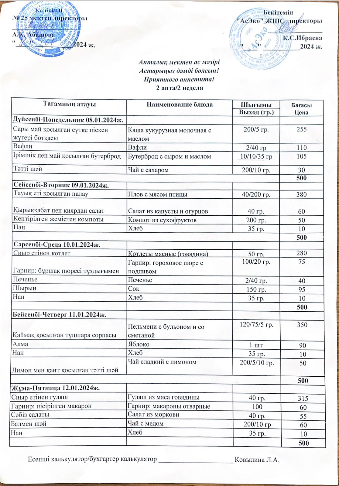 08.01.2024-12.01.2024ж аралығында ас мәзірі