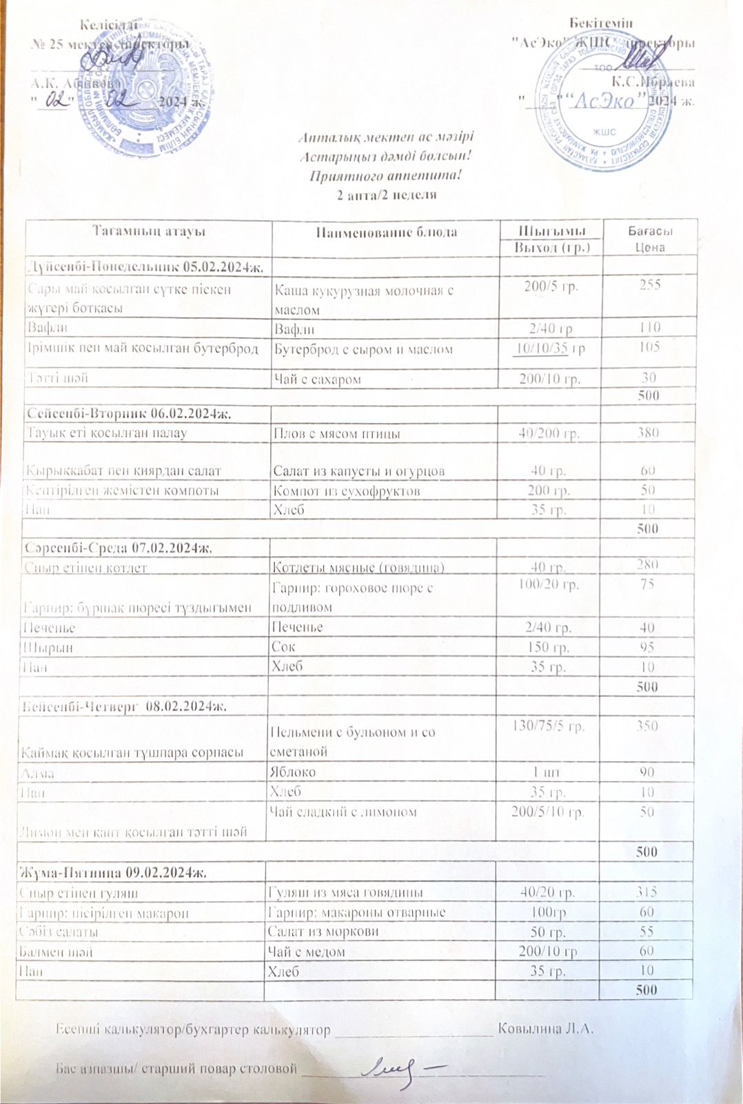 05.02.2024-09.02.2024 аралығында ас мәзірі » СШ №25