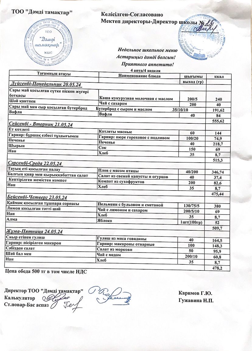 20.05 - 24.05.2024 аралығындағы ас мәзірі