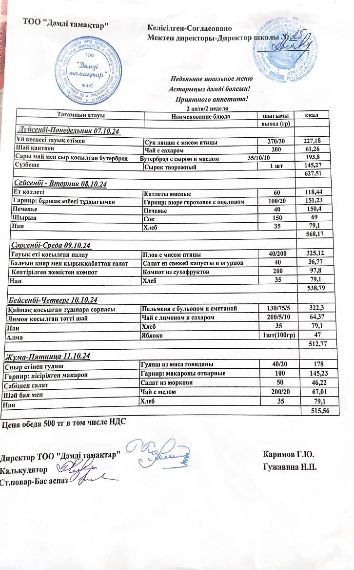 07.10.24 - 11.10.24ж. аралығындағы ас мәзірі