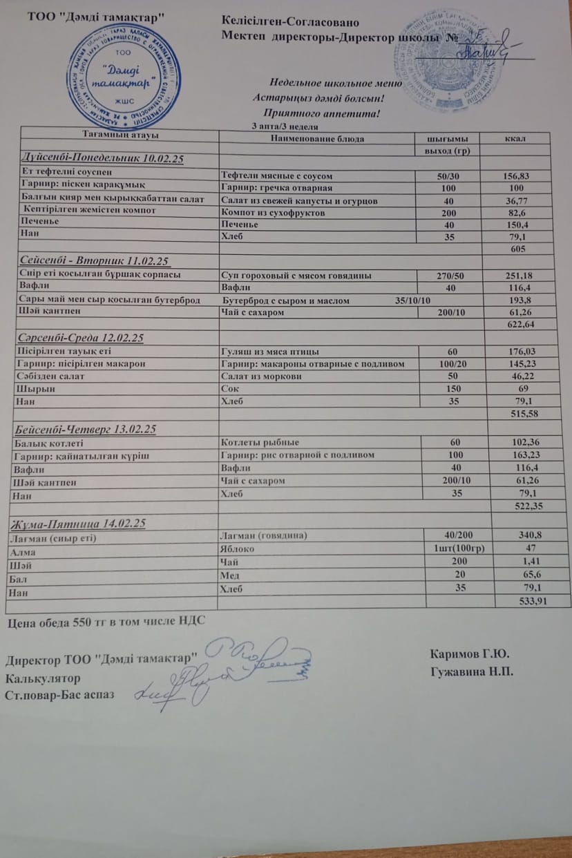 10.02.2025 -14.02.2025 жыл аралығындағы ас мәзірі