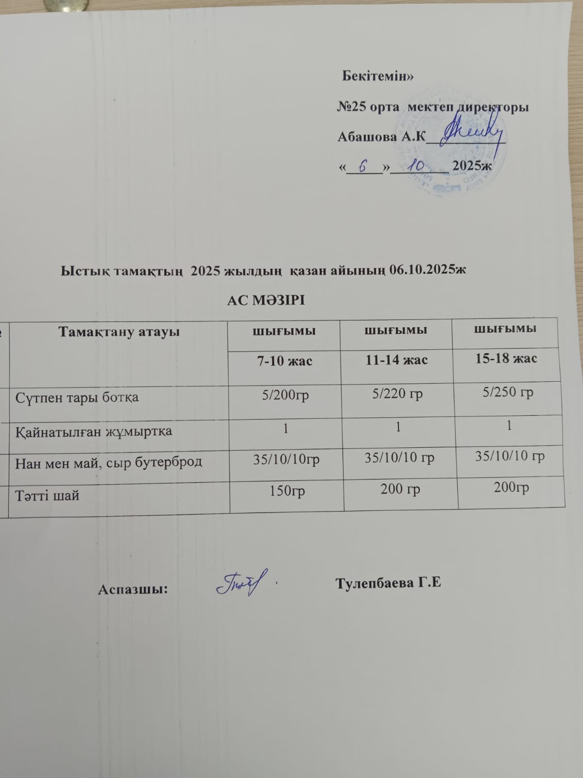 24 сентябрь 2025 Апталық ас мәзірі