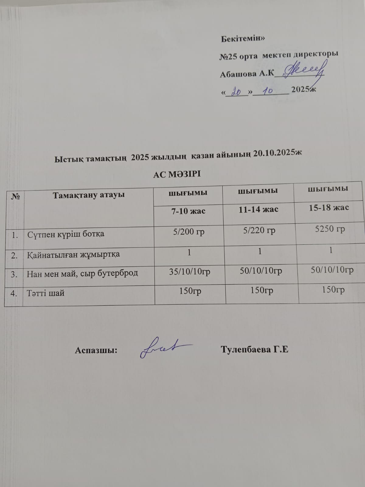 24 сентябрь 2025 Апталық ас мәзірі