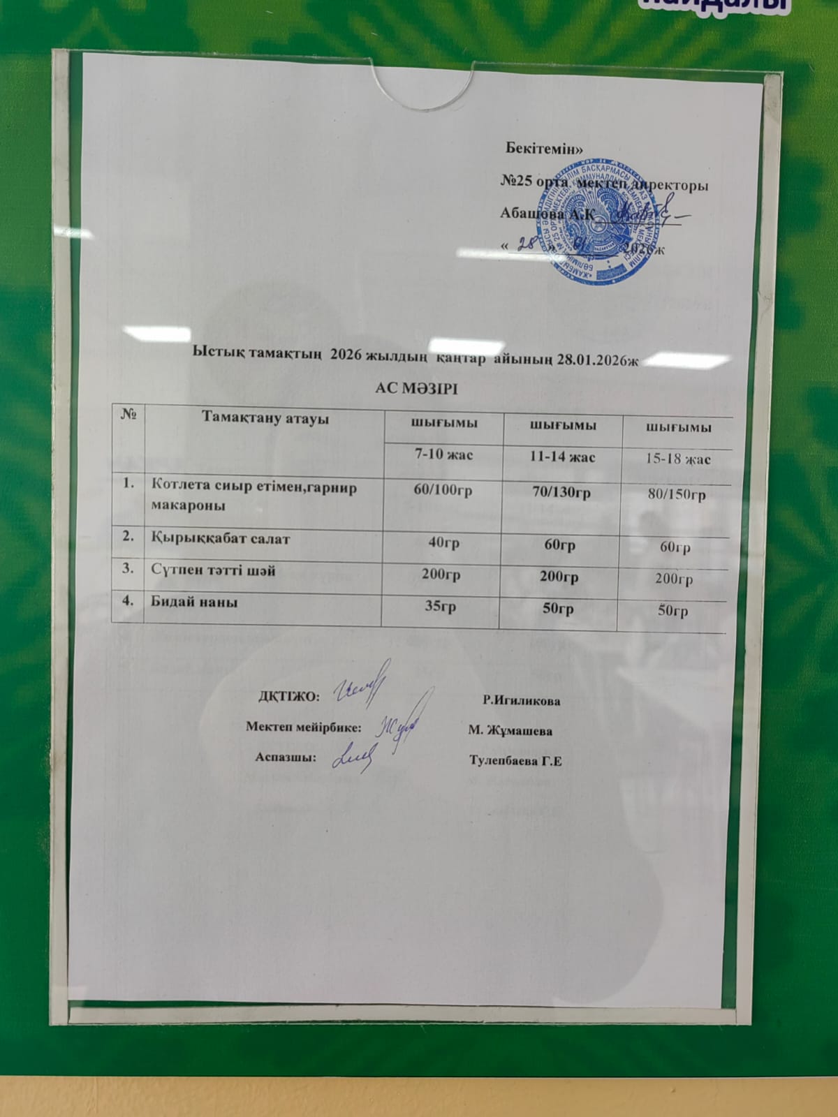 24 сентябрь 2025 Апталық ас мәзірі