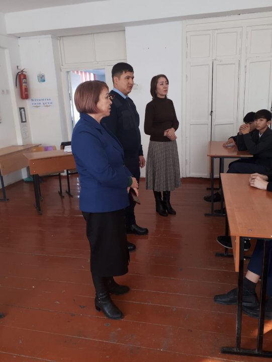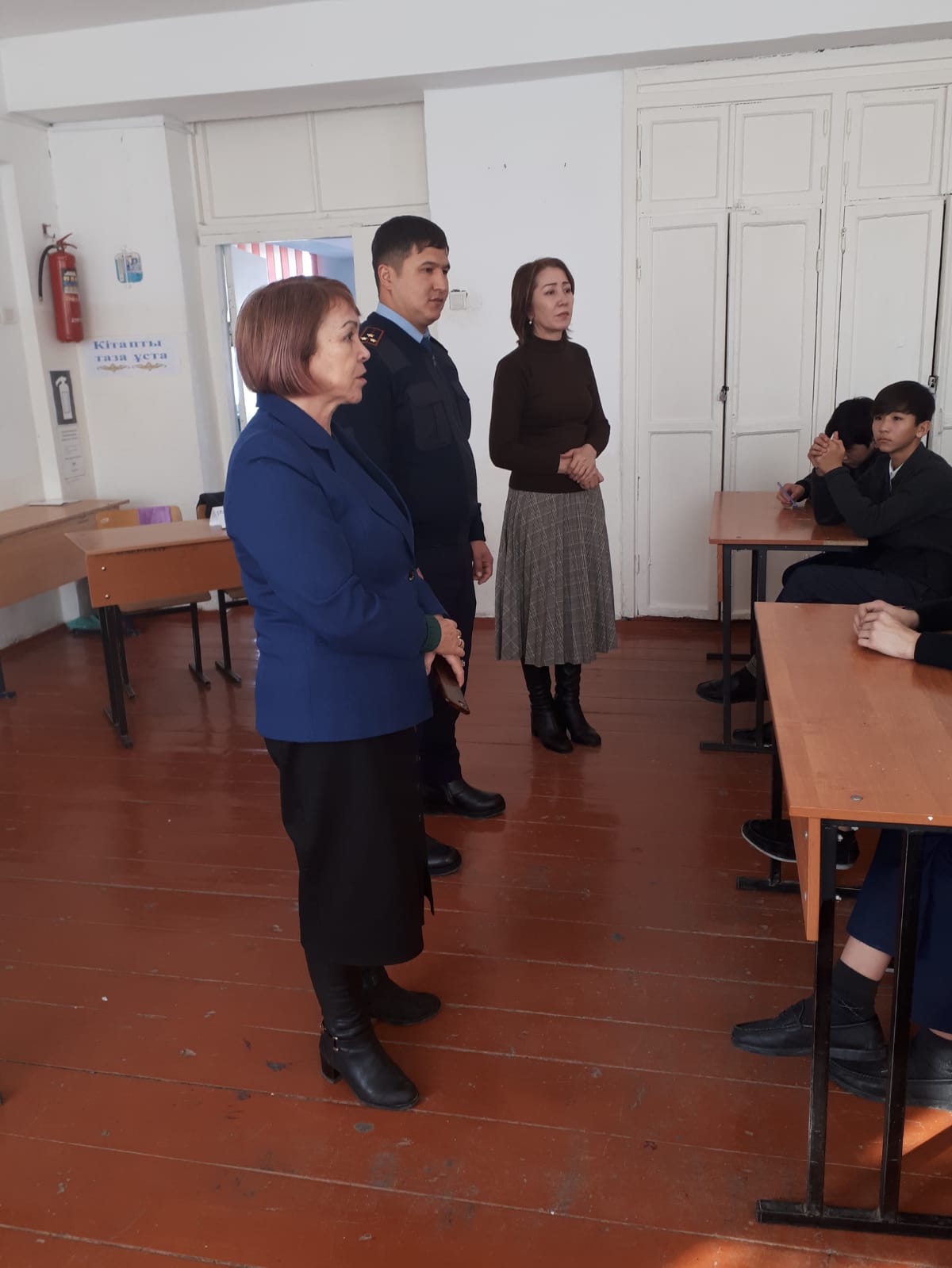 "Жасалған қылмыстар үшін жауапкершілік. Олар не үшін тіркелген" тақырыбында жоғары сынып оқушыларымен ДҚТІЖО Р.Игиликова, мектеп психологы Б.Жолдасова және Тараз қ. ПБ ЖПКБ ЮПБ УПИ полиция аға лейтенанты А.Тансыкбай қатысуымен әңгіме жүргізілді.