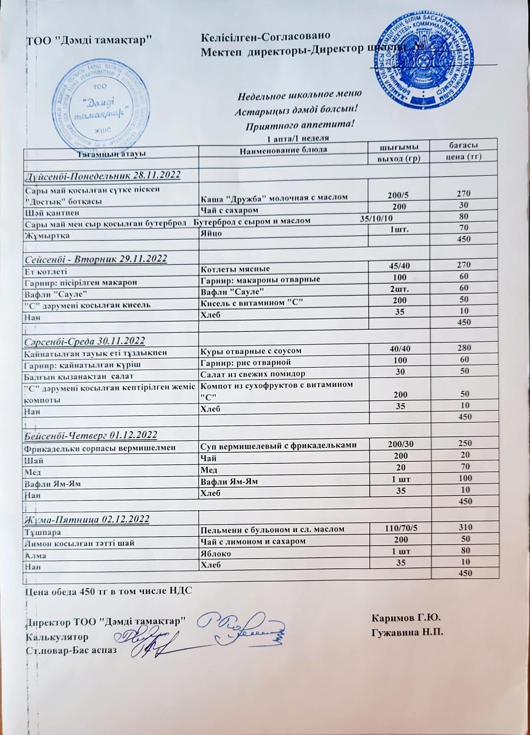 » » Мектептің 28.11. - 02.12.2022 аралығындағы апталық ас мәзірі