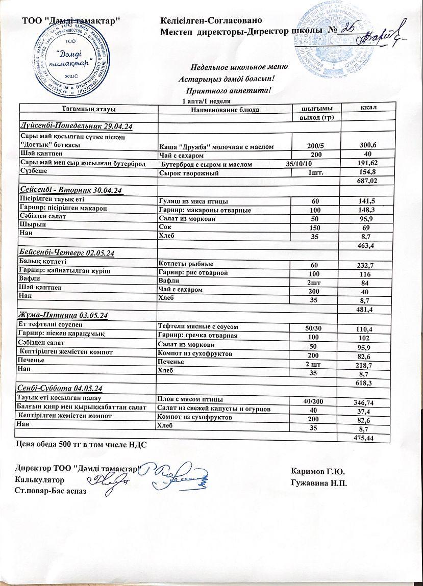 29.04.24 - 04.05.24 аралығында ас мәзірі