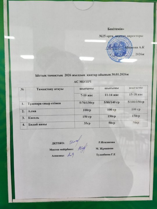 24 сентябрь 2025 Апталық ас мәзірі